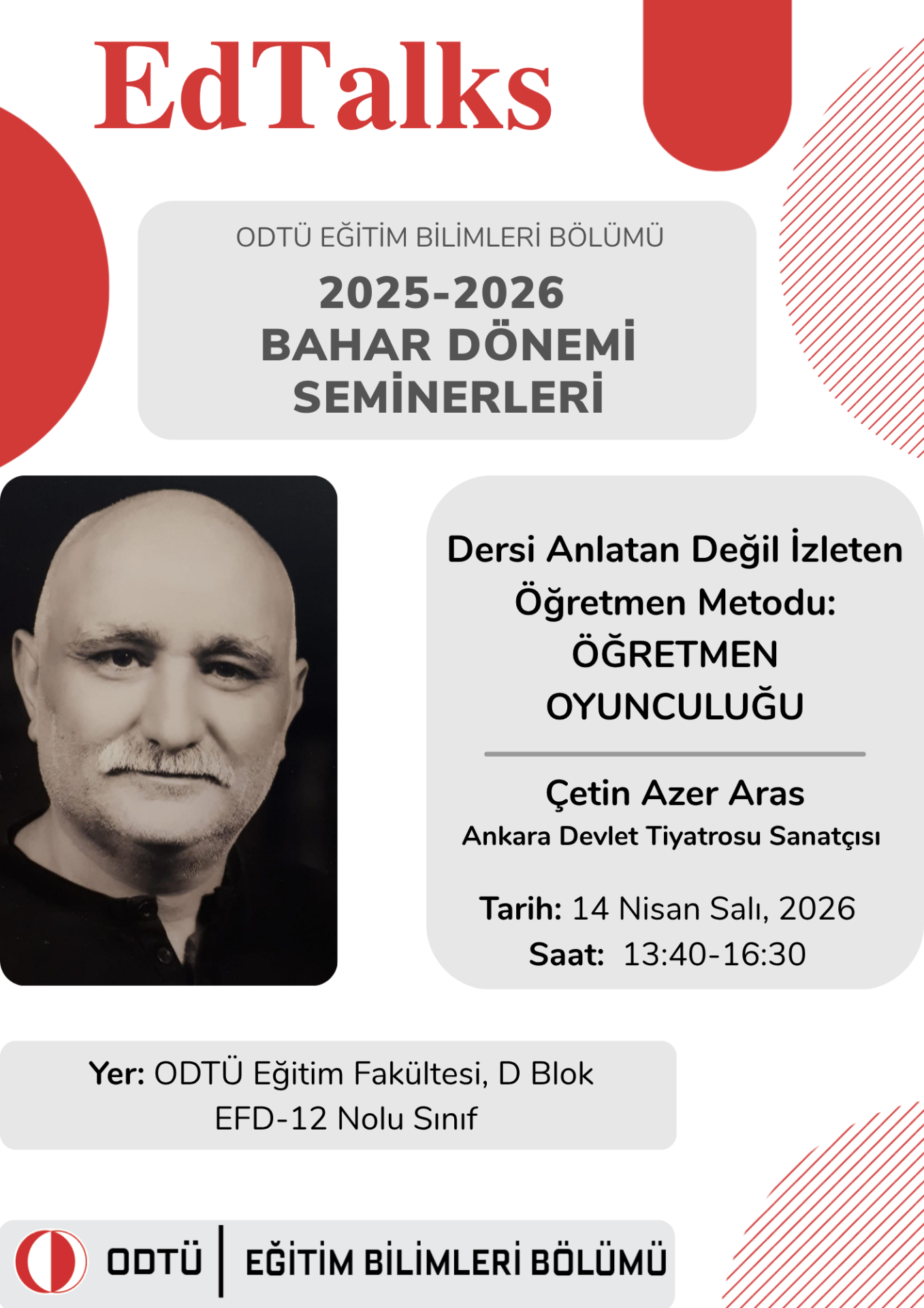 Eğitim Bilimleri Bölümü tarafından düzenlenen EdTalks seminerlerinin Bahar Dönemi seminerlerinden biri, 14 Nisan 2026 Salı günü saat 13:40-16:30 saatleri arasında Ankara Devlet Tiyatrosu Sanatçısı Çetin Azer Aras tarafından “Dersi Anlatan Değil İzleten Öğretmen Metodu-ÖĞRETMEN OYUNCULUĞU” başlığı ile düzenlenecektir. Etkinlik yüz yüze yapılacaktır. Ekte etkinliğin afişine ve etkinlik katılım bilgilerine ulaşabilirsiniz. Çetin Azer Aras (1965), Ankara Devlet Tiyatrosu sanatçısıdır. Hacettepe Üniversitesi Ankara Devlet Konservatuvarı Tiyatro Oyunculuk Bölümü’nden 1991 yılında mezun olmuş, iletişim alanındaki akademik çalışmalarını Celal Bayar Üniversitesi Tıp Fakültesi Psikiyatri Anabilim Dalı’nda İletişim Psikolojisi üzerine yüksek lisans yaparak (2016) sürdürmüştür. Mesleki kariyeri boyunca tiyatro sanatını iletişim, eğitim ve mesleki gelişim alanlarıyla birleştiren Aras; Türkiye genelinde 112 Acil Sağlık Hizmetleri çalışanlarından kamu hastaneleri personeline, Maliye Bakanlığı çalışanlarından Millî Eğitim Bakanlığı öğretmenlerine, emniyet birimlerinden özel sektör çalışanlarına kadar geniş bir kitleye “Mesleki Rol Gelişim” ve “İletişimde Kriz ve Risk Yönetimi” eğitimleri vermiştir. “Öğretmen Oyunculuğu” yaklaşımıyla öğretmen eğitimleri yürüten Aras, aynı zamanda siyasal iletişim, davranış ve konuşma teknikleri üzerine çalışmalar gerçekleştirmekte; çeşitli kurumlarda tiyatro toplulukları kurup yönetmektedir. Devlet ve özel tiyatrolarda 70’in üzerinde oyunda oyuncu, yönetmen ve yönetmen yardımcısı olarak görev almış; televizyon projelerinde farklı roller üstlenmiştir. Kurucusu ve başkanı olduğu Meddahlık ve Sözlü Anlatım Sanatları Derneği bünyesindeki çalışmalarının yanı sıra, 2024 yılında deprem bölgesinde uygulanan Avrupa Birliği destekli bir sosyal sorumluluk projesini hayata geçirmiştir. Halen Ankara Devlet Tiyatrosu’nda sanatçı olarak çalışmalarını sürdürmektedir. Etkinlik Bilgisi: Tarih: 14 Nisan 2026, Salı Saat: 13.40-16.30 Yer: ODTÜ Eğitim Fakültesi, D Blok (Yeni Bina), EFD-12 Nolu Sınıf (Zemin Kat) Katılımlarınızı bekleriz. EBB EdTalks Ekibi |