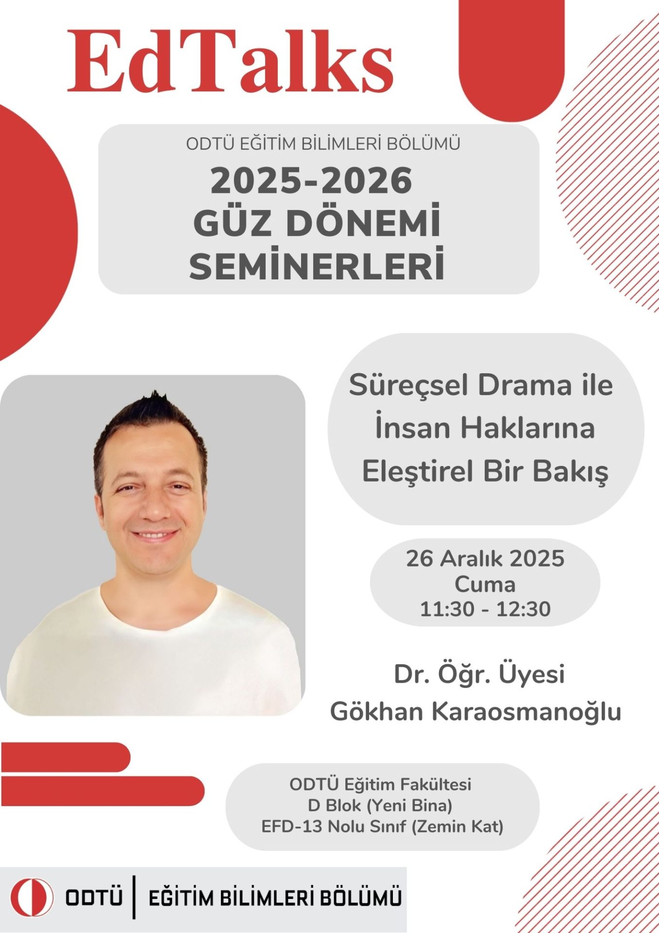 Dear List Members, This EdTalks session, organized by the Department of Educational Sciences, will be held on Friday, December 26, 2025, between 11:30 and 12:30. The seminar will be delivered by Dr. Gökhan Karaosmanoğlu, who is currently a faculty member at the Department of Basic Art Education, Faculty of Fine Arts, Ankara University. The event will be held face-to-face, and the language of the event will be Turkish. About the Speaker: He has conducted various creative drama studies with adults, teachers, and high school students. His research and practice areas include process drama, creative drama, theatre, forum theatre, cyberbullying, drama in museums, online drama practices, digitalization in education, creative writing, and drama studies with refugees. He has been actively involved in drama, theatre, and forum theatre practices with diverse groups in public spaces. He is currently serving as a faculty member at Ankara University, Faculty of Fine Arts, Department of Basic Art Education. Event Details: We look forward to your participation. EBB EdTalks Team |