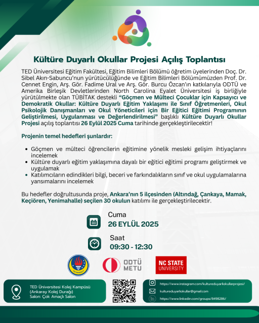TED Üniversitesi Eğitim Fakültesi, Eğitim Bilimleri Bölümü öğretim üyelerinden Doç. Dr. Sibel Akın-Sabuncu’nun yürütücülüğünde ve Eğitim Bilimleri Bölümümüzden Prof. Dr. Cennet Engin, Arş. Gör. Fadime Ural ve Arş. Gör. Burcu Özcan’ın katkılarıyla ODTÜ ve Amerika Birleşik Devletlerinden North Carolina Eyalet Üniversitesi iş birliğiyle yürütülmekte olan TÜBİTAK destekli “Göçmen ve Mülteci Çocuklar için Kapsayıcı ve Demokratik Okullar: Kültüre Duyarlı Eğitim Yaklaşımı ile Sınıf Öğretmenleri, Okul Psikolojik Danışmanları ve Okul Yöneticileri için Bir Eğitici Eğitimi Programının Geliştirilmesi, Uygulanması ve Değerlendirilmesi” başlıklı Kültüre Duyarlı Okullar Projesi açılış toplantısı 26 Eylül 2025 Cuma tarihinde gerçekleştirilecektir!